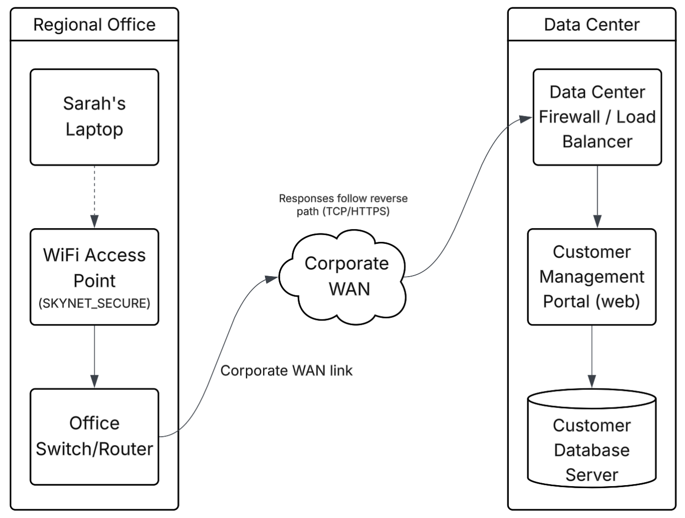 ). Analyzing this single lookup through the OSI model clarifies how each network layer contributes to security, reliability, and performance as the request traverses the Regional Office, Corporate WAN, and Data Center—and hoow those layers interoperate to deliver actionable information to the browser.