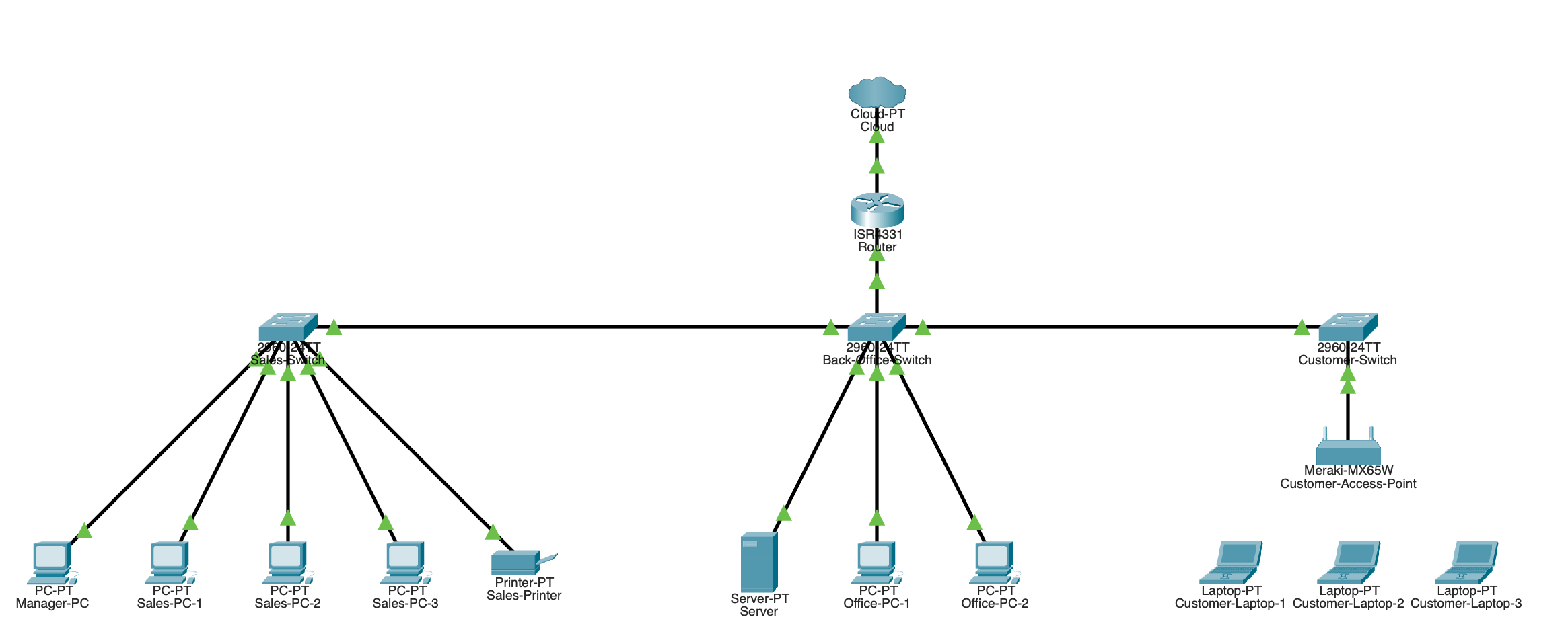 - Each switch is for their own section essentially. The main limitation behind this setup was the router not having 3 ethernet ports that were able to be configured for the VLANs, so I had to set up the back office switch as a “core switch” that connected to the guest and the sales VLANs.